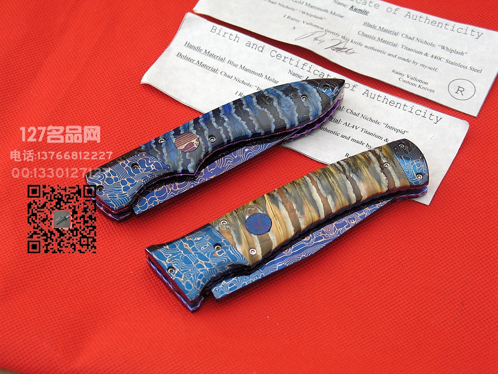 USA微技术御用锻造大师美国ABS定制刀匠Vallotton 手工定制侧弹,猛犸象牙化石刀柄 Chad Nichols马赛克蓝色大马士革钢.