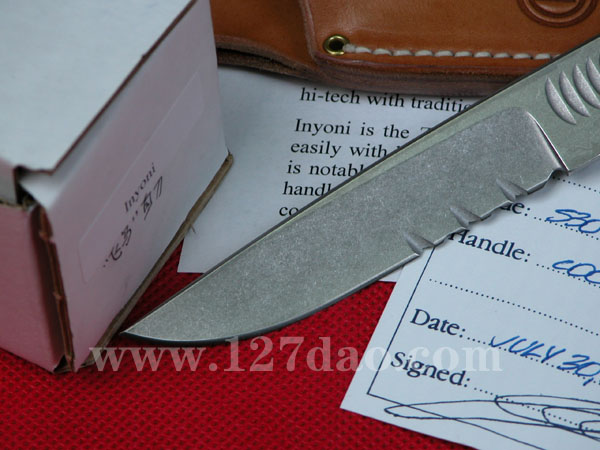 “Inyoni” 漁獵刀的外觀和構造非常簡單,但其實刃型、外型線條以及鑲嵌都經過仔細的佈局與設計。雖然握柄呈現扁平狀態,但藉著彎曲的線條,紫檀木鑲嵌的位置,加上中央9道防滑溝槽,讓Inyoni漁獵刀握在掌中非常順手。鋸齒的位子與角度也與一般刀款不同,兩側都有齒(一般齒刃刀只有一側有尺),呈現不對稱排列,鋸齒角度也與刀刃成斜角,如此特別的設計,讓Inyoni漁獵刀的切割能力不同凡響。
