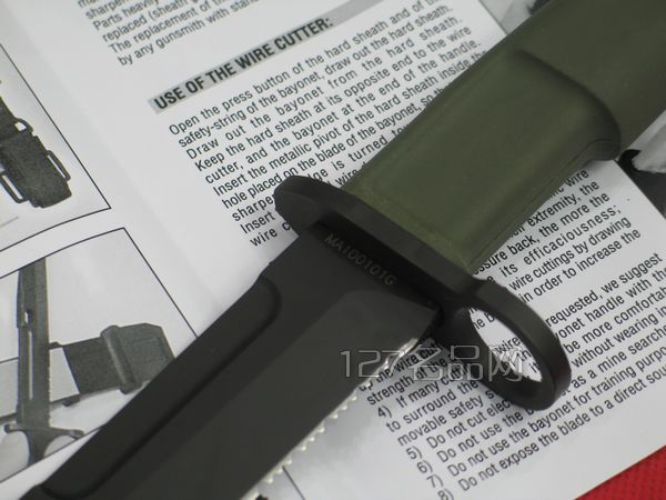 刀鞘, 类似于M9的设计,可以配合刀背来剪铁丝,电网等。异常结实强大的大绑带, 快速的开启系统允许不解开腿带子而使用刺刀,刀鞘来剪铁丝。