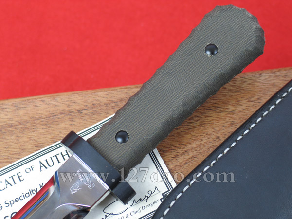 包括:皮套 具有镜面抛光刀片双斜面线和研发,绿色帆布Micarta处理,并注明U-31钢是一个微细钢所作的日本高周波钢有限公司,它具有硬度高,硬度64 ,是3倍强硬比D2类。据报道,长10倍以上非他明类兴奋剂举行边缘- 34根据切削试验。