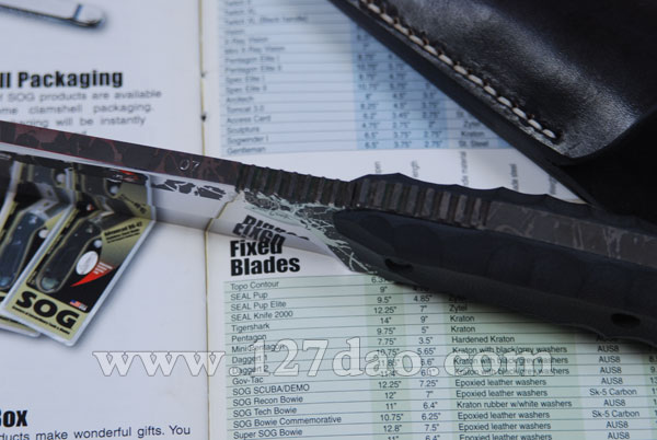 具有镜面抛光刀片双斜面线和研发,绿色帆布Micarta处理,并注明- 31钢。欧- 31钢这是一个微细钢所作的日本高周波钢有限公司,它具有硬度高,硬度64 ,是3倍强硬比D2类。据报道,长10倍以上非他明类兴奋剂举行边缘- 34根据切削试验。