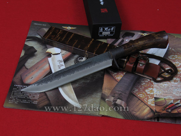 以日本古代製造工法打造的橡木柄大獵刀"極",採鐵與鋼相結合,具有三樣特徵:(一)擁有良好的切割性能,及平衡的手感;(二)鋼材部分硬而薄,包夾在鐵裏的鋼,會順著磨刀的角度,依序往上露出,永保刃口鋒利;(三)經水淬火的刃口自然形成波浪紋路,有些甚至起微妙的晶化而泛藍光,渾然天成的美感乃歐美刀具無法比擬。