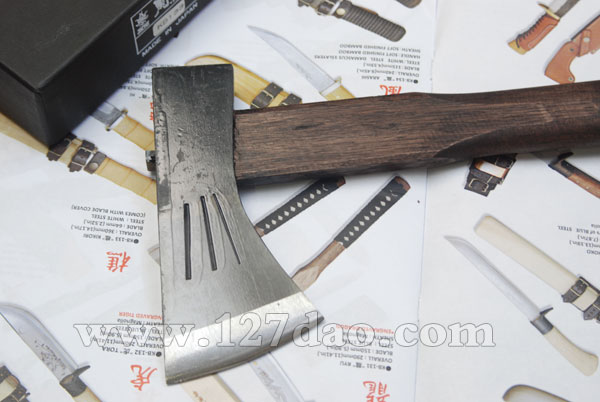 這是一款難得的斧頭,除了實用功能,外觀上亦仿造古日本做法,握柄以橡木為中心,外表包覆鯊魚皮革,再以繩索纏繞,充滿十足的和氏刀具特色。