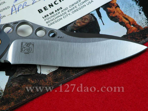 刀刃使用頂級 S30V 不鏽鋼製造,刀背修磨成圓潤光滑狀態,刃面為細膩的緞面打磨(satin finish)。背夾、螺絲等組件,則則經過24K鍍金處理,相當耀眼奪目