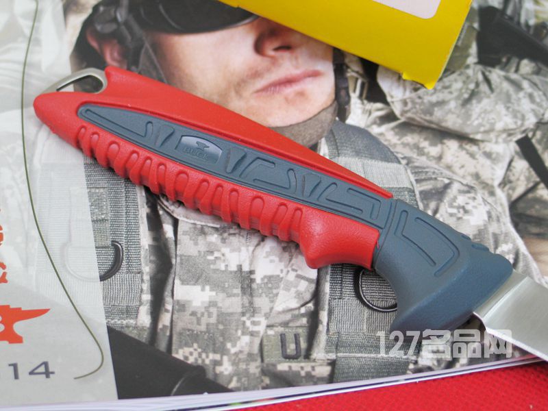 手柄为灰色尼龙材质,并贴有青色橡胶。呈现一种战术刀柄的风格,表面有一层防滑纹路,尾部开有系绳孔。此外,还配有注塑尼龙护鞘。灰色的刀鞘上有大量的排水孔,还有皮带孔,可以系于腰间方便随身携带。