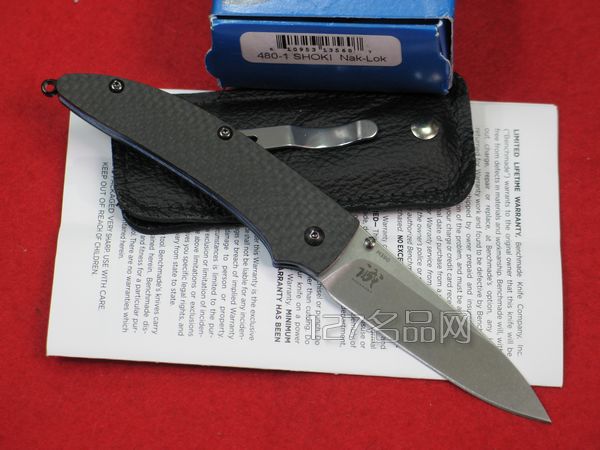 Benchmade发行的精致绅士折刀,想必得以塑造高质感、典雅风格为主要诉求,在这款”Shoki"折刀上,也具备这些要素:细长而扁平的外型、重量极轻,适合随身携带;顶级M390超级不锈钢的凹磨刀刃,有白镴(Pewter)色表面的研磨处理,质感内敛,刀背有圆滑处理(crowned back);碳纤维合成握柄,实用耐看;折刀内部骨架为电镀处理的钛金属,配合新开发的Nak-Lok卡榫机制,简洁易用。