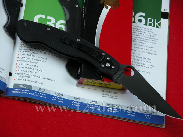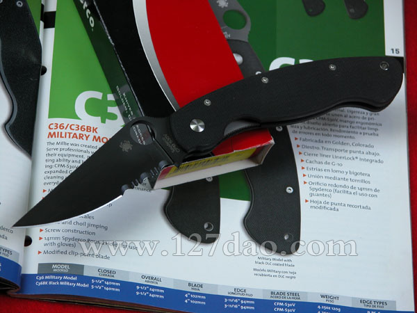 請您注意這把〝永不妥協〞的刀款,它將在任何狀況中助您一臂之力。沒錯!這把就是SPYDERCO刀廠最猛的軍用折刀(MILITARY MODEL) 鋼夾式,無套。纖細柔順的G-10握柄加上加強設計的高強度卡榫,CPM-440V及S30V兩種的優質強軔鋼材 選製,使這把美國高登市製作的刀成為軍警人員的新寵,無論處於何時何地,這把SPYDERCO軍用折刀將是您唯一值得信賴的伙伴.