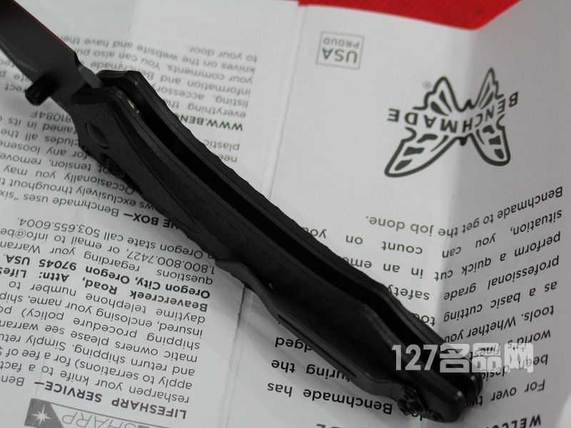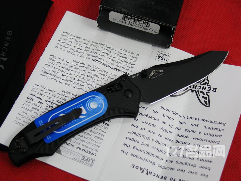 在 2008 年 940 系列的進化版終於推出,也就是目前您所看到的950 "Rift" 蝶紋 G-10 柄折刀。它同樣擁有逆Tanto刃型,以 154CM 不鏽鋼製造,並將 940 慣用的鋁合金手柄,改成 G-10 材質,並增加我柄寬度,使用 CNC車工,讓 G-10 顯現出如蝶翼般的紋路,在視覺上相當搶眼,功用上有防滑穩定的作用。全黑柄款式防滑紋路較為簡化