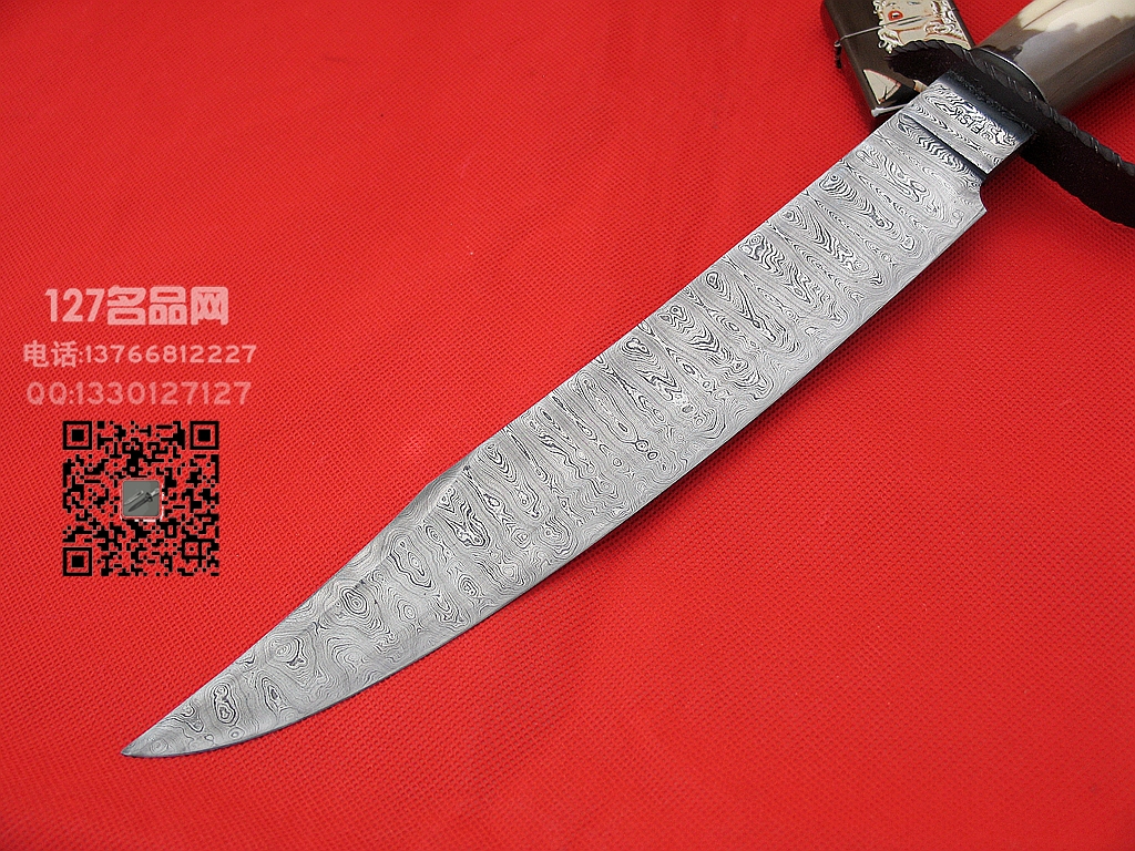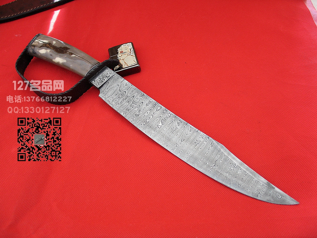 美国ABS刀匠协会MS级大师前三杰瑞.菲斯克全手工打造,孤品唯一。杰瑞是美国锻造界最具影响力的人物,其锻造水准出神入化。有众多独家大马款式,纹理多具特色,写意般的流畅质感别具一格。国内可谓名望最高的MS大师之一,无需多做诠释。此把博伊为国家宝藏系列大马士革,行云流水一般的纹理分布均匀,彰显功力。前端刀背为真刃,研磨细腻,非常犀利。护手为古碳钢制成,手柄选用琥珀色鹿角制成,粗犷洒脱,握感饱满扎实。尾铁同样为古碳钢制成,细节到位,非常有个性。整刀手感可谓卓越非凡,拿在手里不忍割舍,配手工皮鞘,完美匹配。大师手笔转瞬即逝,杰瑞的作品在美国最里获得大奖人物,炙手可热,切莫错过。