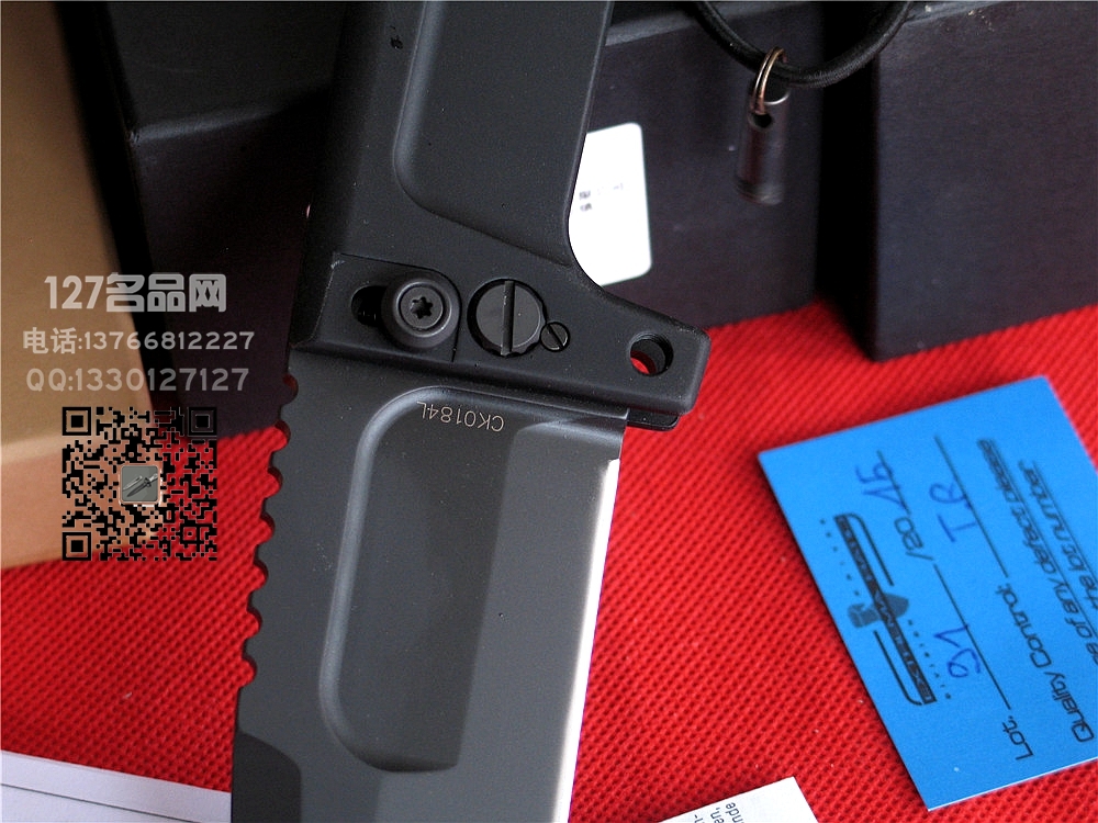 本身的轴锁装置外,额外的设计一个安全装置是一个钢的螺丝钉是手动拧两片anticorodal 铝的合金柄放置的洞内。在配上战术尼龙多功能刀鞘,包内还有小型磨刀片,战术尼龙多功能刀鞘,即可放置在口袋里,也可悬挂在战术背心上~!