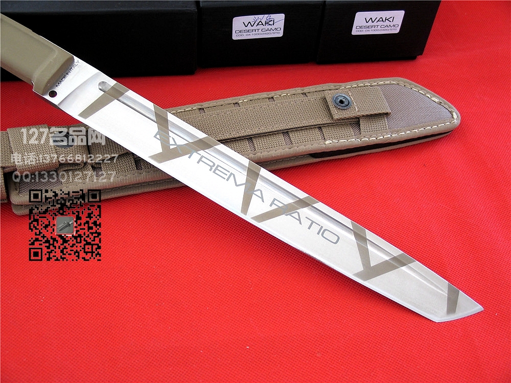 Extrema Ratio极端武力WAKI DEERT CAMO STG“马托”系列是极端武力产品里最新的一款中级多用途排障刀位于巴西西部是巴西二十六个州之一,首府库亚巴。1822年建省,1899年改州。大部分地区为草地相间的灌丛林地。此款采用这个地名命名,也有是丛林刀的意思。 采用弧形造型设计,犀利流畅;整刀采用德国N690钢制造而成,硬度保持在58HRC强度;T头而窄细的刀身则便于操控;不论劈砍还是格斗,都十分得手;刀身为一体龙骨结构,手柄为FORPREN北约军规材质制造而成,耐腐蚀,耐高温和抗低温;即使在零下40度依旧性能出色;随刀附带一个高级意大利制造的沙色为尼龙鞘钢本色一体龙骨多用途排障刀拉丝处理.