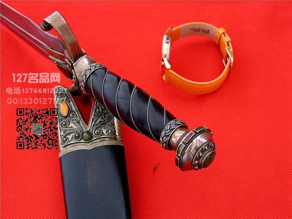 一个非常酷的和不寻常的作品,一个由美国成名的Rob Charlton一一Rob大马士革地狱剑匕首,是在纽约上世纪左右的作品.也是件艺术传家宝作品.手柄乌木银丝卷有嵌宝石. 鞘是木与真皮包裹加上银雕花嵌宝石. 这是把值得收藏老物件.