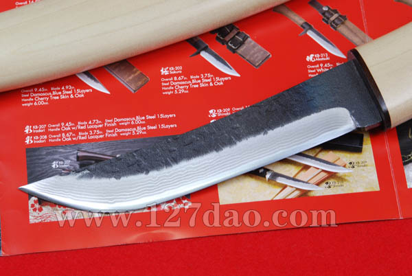 本款刀品使用日本青紙鋼打造,15層的鍛造結構,形成似梯田的細密紋路。刀鞘與柄使用的木材為木蘭(Magnolia)。隨刀都附一個華麗的錦織袋,是相當具收藏價值的刀款。(本產品在日本製造)