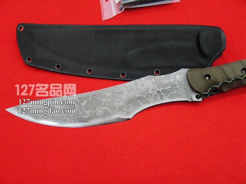 刀身沿用菊男老师钟爱的OU-31钢,刃部前端采用凸磨式研磨,让刀具拥有极强的抗压能力,保证刃部的稳定性;刃部后端以凹磨打磨,更具切割力,扇贝型的研磨刃面具备惊人的“咬合力”。S形刀具轮廓让刀头部分分量十足,在挥舞式能产生意想不到的破坏力,针尖状的刀头和菊男出色的研磨让其破入力出色,可轻松破入轻型防护装置。刀身表面采用菊男独特的战术蚀刻花纹处理,刀根上端刻有“菊”字标识和钢标号。
