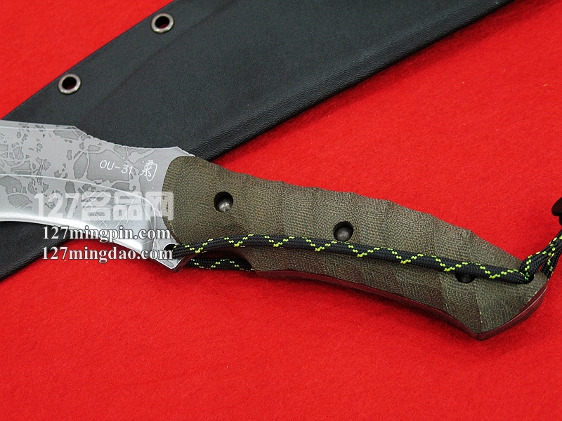 手波状外形的军绿色帆布米卡塔手柄提供了出色的把握力,刀根下端和柄尾的系绳孔使用迷彩伞绳制成的手部固定绳,即使在粗用过程中也能保障刀具处于控制之内。柄身上端和尾部的拇指凹槽,无论是正手或是反手持握都极为便利。随刀还配赠拥有Tek-Lok便携装置的手工定制Kydex鞘。
