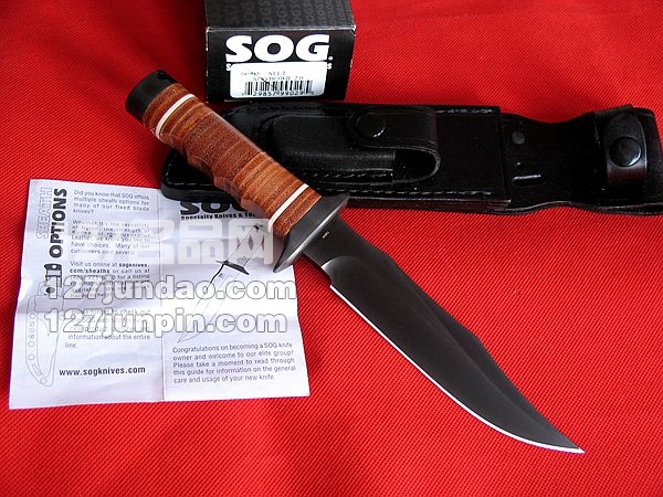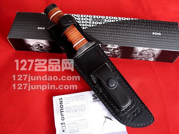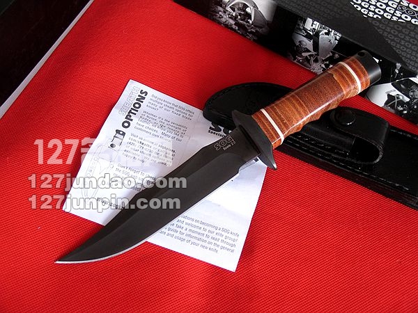 这把SOG美国哨格 S1T-L越战经典战斗刀博伊战术刀,是为了庆祝SOG成立20周年,所特别推出的款式。除了拥有SOG一贯的直刀样式,还结合新材质、新制作技术,将旧有的产品升级,成为新一代的产品特战刀,刀刃采用AUS8不绣钢,表层有氮化铝钛镀膜处理,抗锈蚀能力与硬度都大幅提升。特别是握柄使用皮革绳缠覆(leather washers),再以环氧化树脂(expoxied)加工处理,使成为光滑坚硬表面。柄尾部份同样为镀膜之AUS8钢可用做铁锤等敲击工具握持性能极好方便携带127名刀网实拍图片.