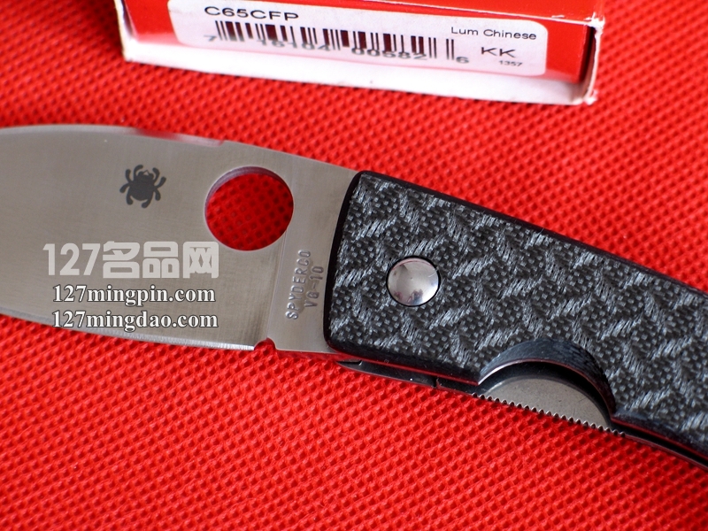 全长:18 刃长:7.9 刃厚:0.3 刃宽:3 硬度:60HRC 产地:日本 材质:VG-10 约重:83克 锁型: 线锁 柄材: 碳纤维 产地: 日本 Spyderco 蜘蛛C65CFP 碳纤柄折刀