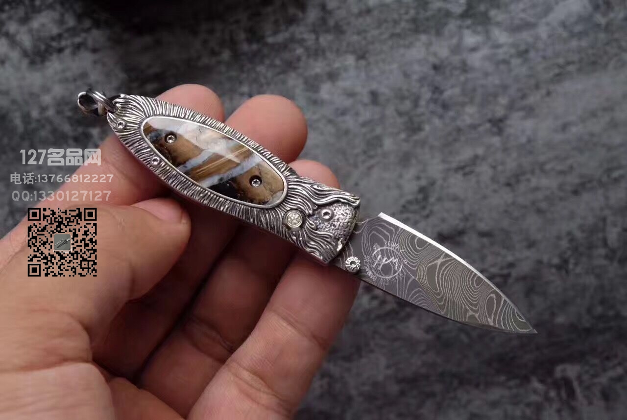 威廉亨利 B02 FIRE 是世界上第一个豪华项链刀。可以挂在脖子上,也可以放在口袋里随身携带。纯银材质刀柄,镶嵌100000年猛犸臼齿化石 ,尼科尔斯手工锻造大马士革钢材刀身。按钮镶嵌天然钻石