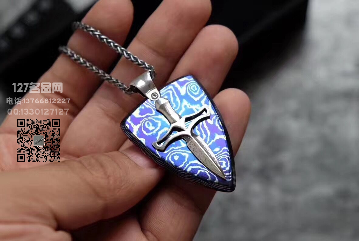 威廉亨利 P32“钛马骑士” 手工锻造的钛合金大马,吊坠上配有纯银短剑和925银链。吊坠含环长4.8厘米,链子长56厘米。